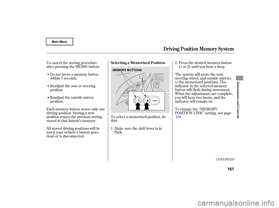 Acura RL 2007  Owners Manual To select  a memorized  position, do