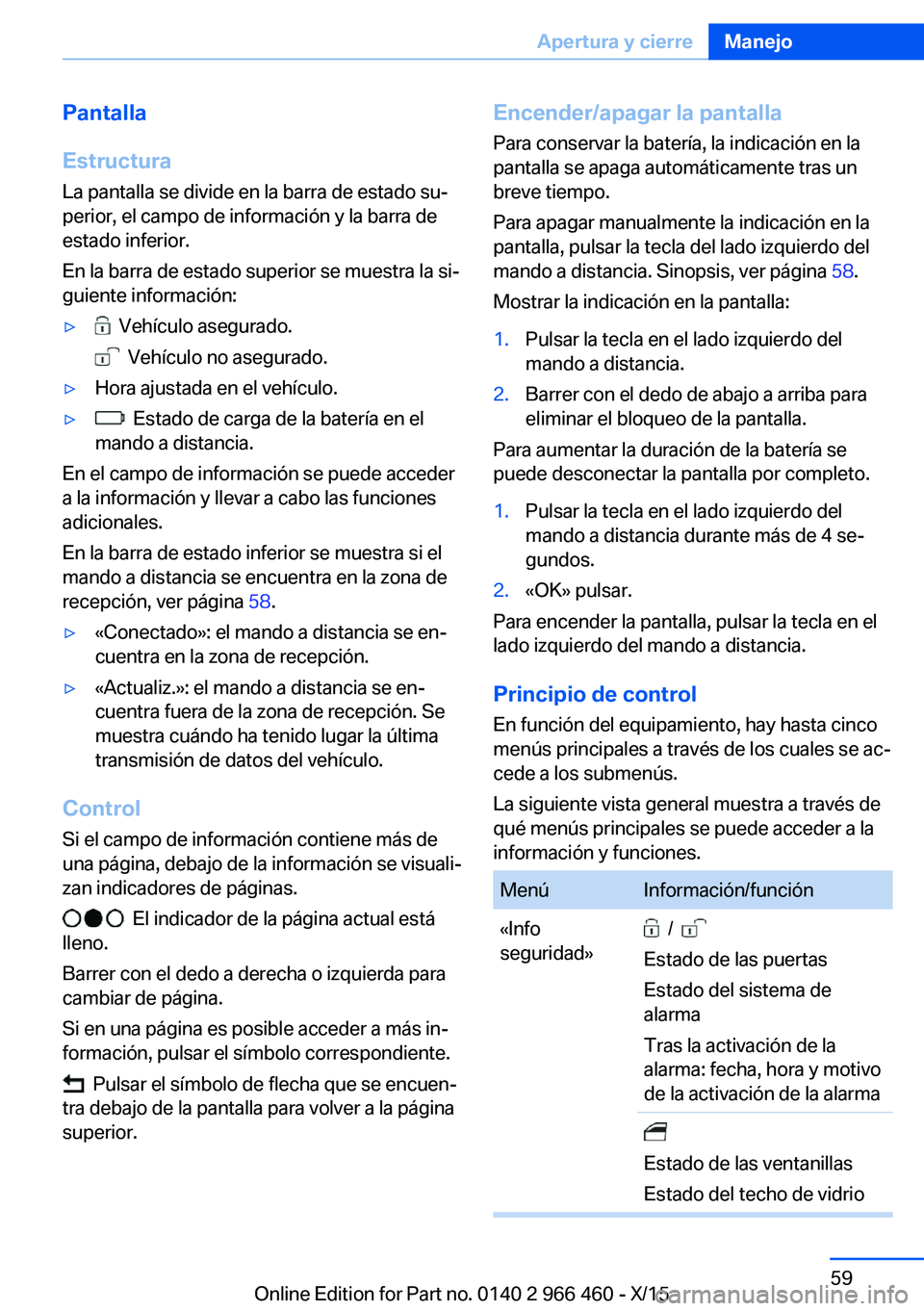 Estado del techo de vidrioSeite 59Apertura y cierreManejo59