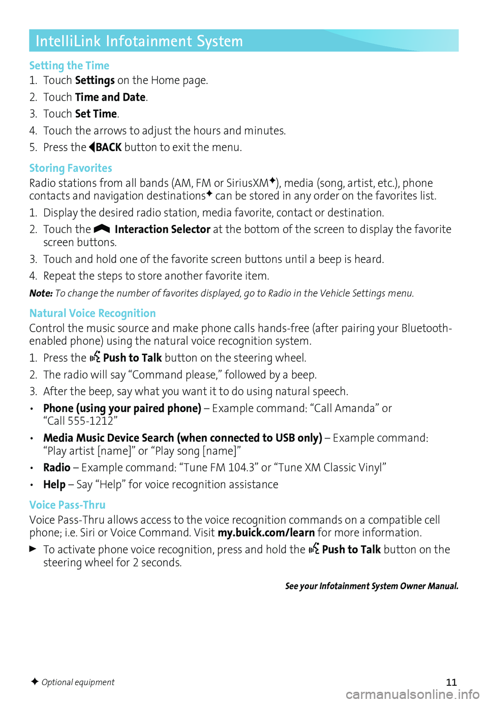 Before using a Bluetooth-enabled device in the vehicle, it must be paired with the in- vehicle Bluetooth system. The pairing process is disabled when the vehicle is moving. Not all devices will support all functions. Visit my.buick.com/learn for more information.
