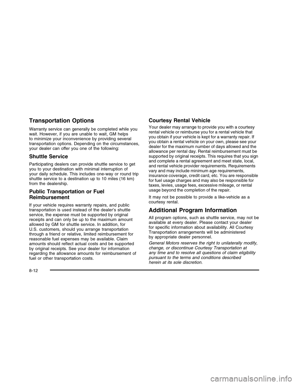 If your vehicle requires warranty repairs, and publictransportation is used instead of the dealer’s shuttleservice, the expense must be supported by originalreceipts and can only be up to the maximum amountallowed by GM for shuttle service. In addition, forU.S. customers, should you arrange transportationthrough a friend or relative, limited reimbursement forreasonable fuel expenses may be available. Claimamounts should reflect actual costs and be supportedby original receipts. See your dealer for informationregarding the allowance amounts for reimbursement offuel or other transportation costs.