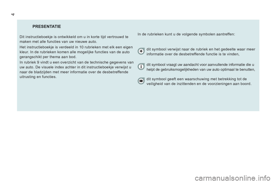 Presentatie4Exterieur 5Openen6Interieur 8Comfort 10Zicht 12Ventilatie 14Controle tijdens het rijden15Veiligheid voor deinzittenden 16Rijden 17Eco-rijden 19