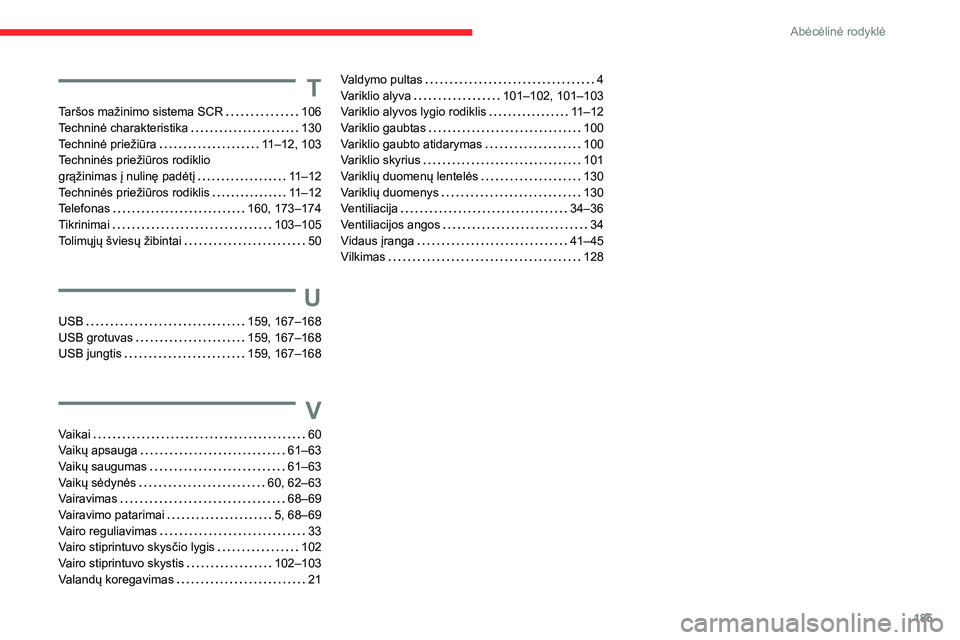 Šoninės oro pagalvės 62Spalvotas ekranas 166Stabdžiai 105Stabdžių diskai 105Stabdžių skysčio lygis 102Stabdžių skystis 102–103Stabdžių trinkelės 105Stiklo valytuvas 53Stiklo valytuvų jungiklis 53Stiklų kėlikliai 29Stiklų plovimo skystis 102–103"Stop & Start" 35, 41, 53, 60, 73–75, 100, 104, 128Stovėjimo stabdys 72, 105Stovėjimo šviesų žibintai 50Šviečiančios kontrolinės lemputės 7–8Šviesos jutiklis 34Šviesų signalas 50Svorio duomenys 130