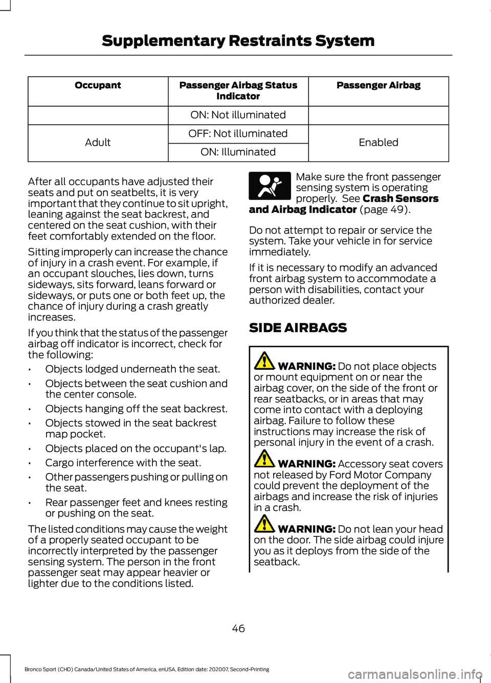 Bronco Sport (CHD) Canada/United States of America, enUSA, Edition date: 202007, Second-Printing Supplementary Restraints SystemE67017