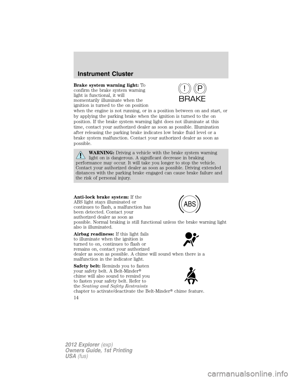 FORD EXPLORER 2012 5.G Owners Manual Brake system warning light:To