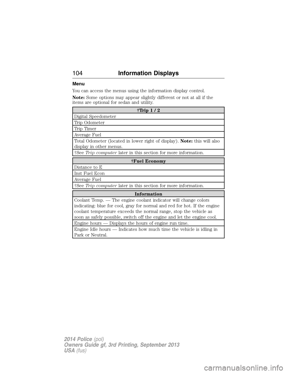 [x] Cancel search | Manufacturer: FORD, Model Year: 2014, Model line: POLICE INTERCEPTOR UTILITY, Model: FORD POLICE INTERCEPTOR UTILITY 2014 1.GPages: 406, PDF Size: 6.86 MB