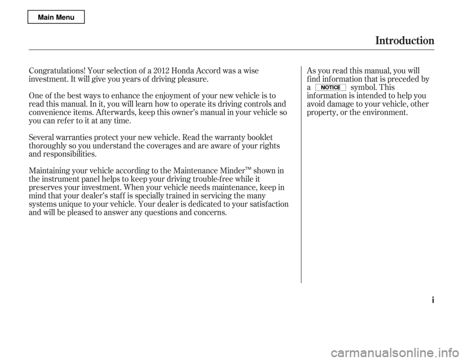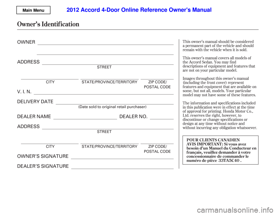 HONDA ACCORD 2012 8.G Owners Manual Main Menu