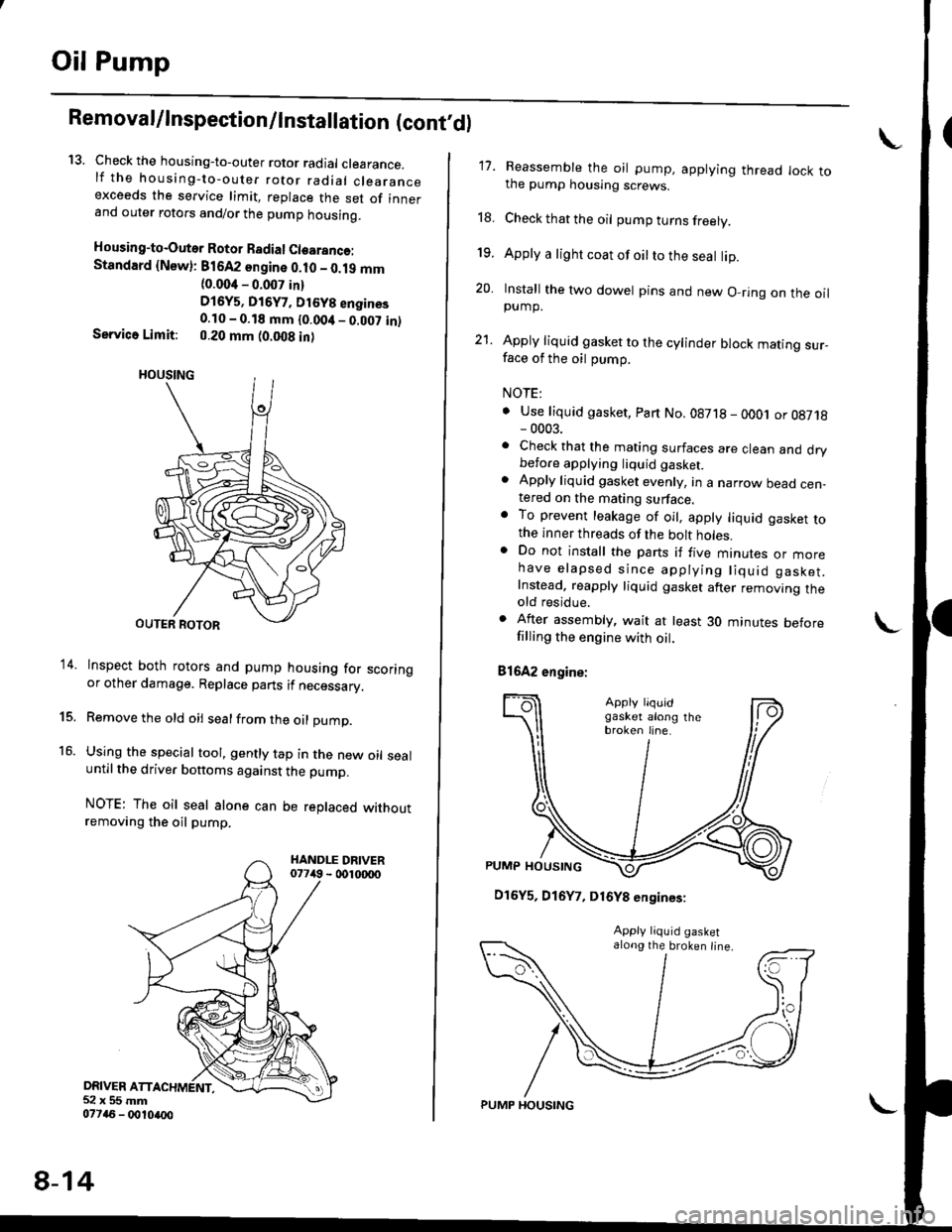13. Check the housing-to-outer rotor radial clearance.lf the housing-to-outer rotor radial clearanceexceeds the service limit, replace the set of innerand outer rotors and/or the pump housing.