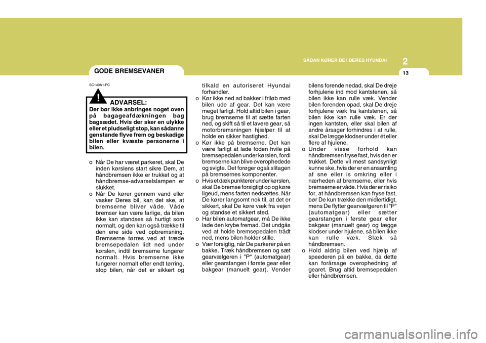 13.Undgå at træde på bremsepedalen i længere tid eller for ofte, da detkunne bevirke en overophedning afbremserne med nedsat bremseevne til følge.