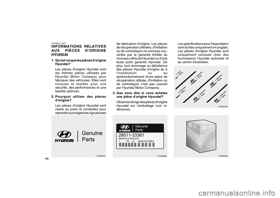 A100A01Lde fabrication d'origine. Les pièces de récupération utilisées, d'imitation ou de contrefaçon ne sont pas cou-vertes par la garantie limitée du nouveau véhicule Hyundai ou d'une toute autre garantie Hyundai. Deplus, tout dommage ou défaillance des pièces Hyundai d'origine du à l'installation ou audysfonctionnement d'une pièce de récupération utilisée, d'imitation ou de contrefaçon n'est pas couvertpar Hyundai Motor Company.