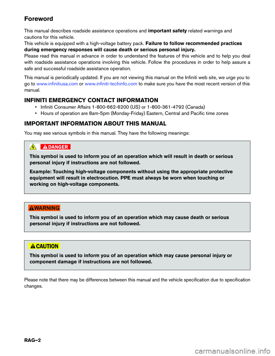INFINITI EMERGENCY CONTACT INFORMATION . . . . . . . . . . . . . . . . . . . . . . . . . . . . . . . . . . RAG–2