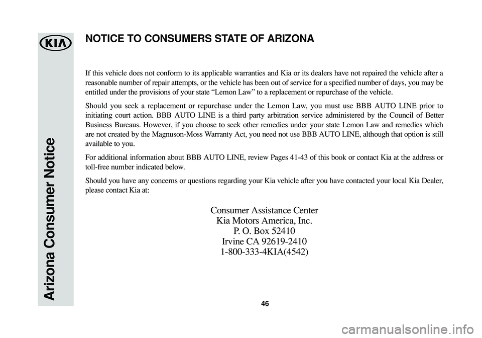 For additional information about BBB AUTO LINE, review Pages 41-43 of this book or contact Kia at the address or