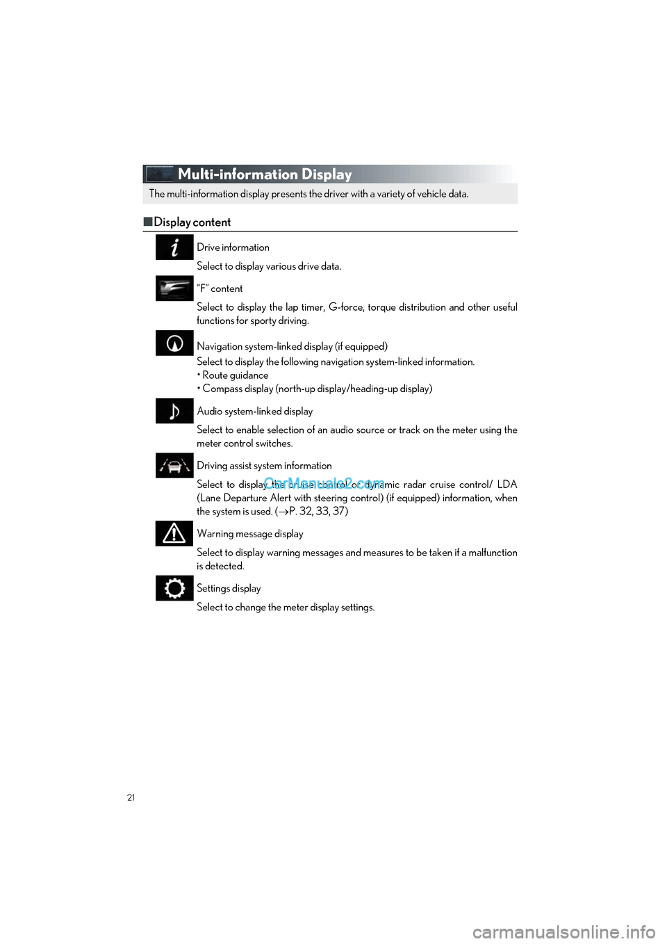 Select to display the cruise control or dynamic radar cruise control/ LDA