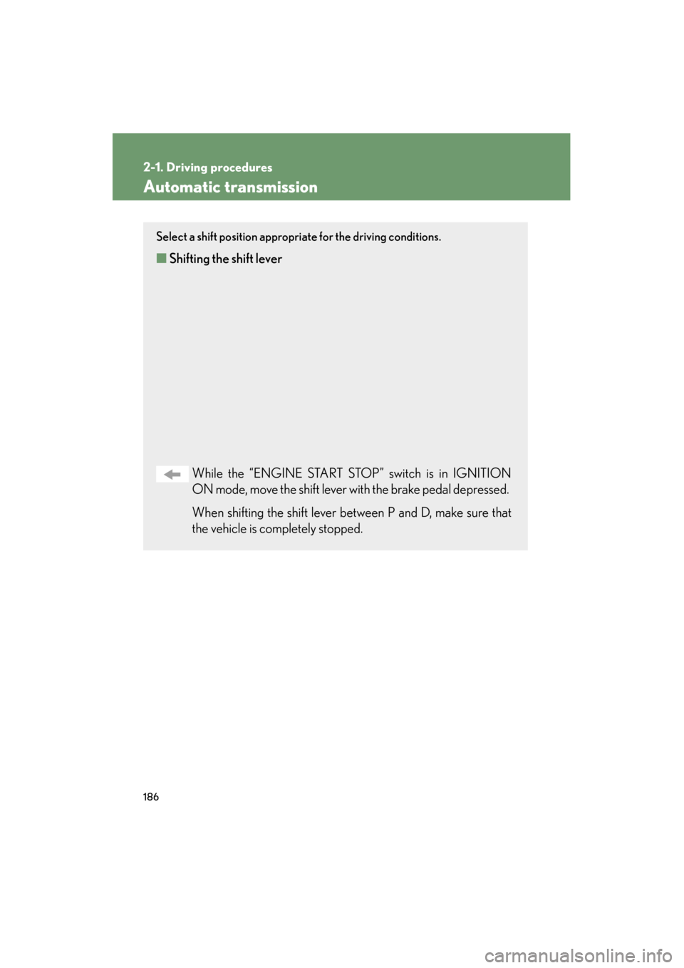 When shifting the shift lever between P and D, make sure that