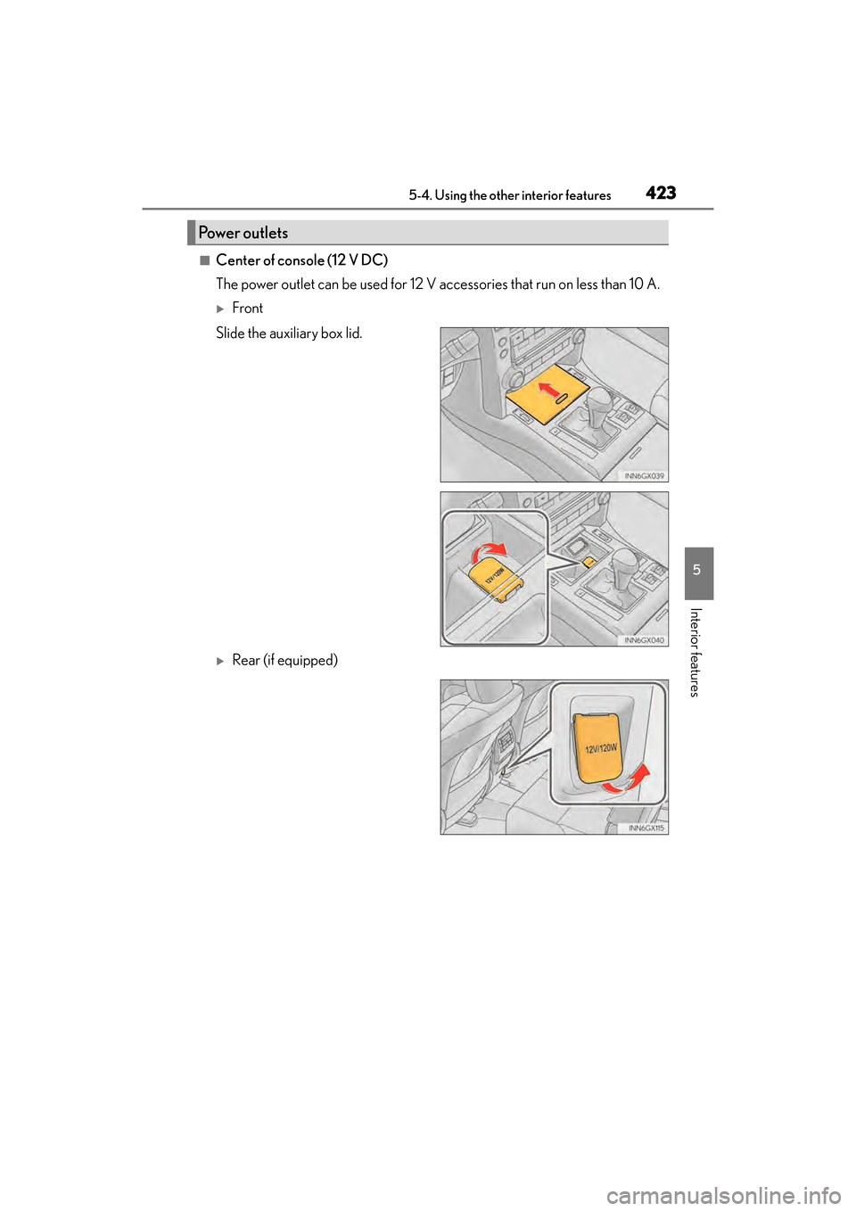 View, print and download for free: Center console - Lexus GX460 2017 Owner's Manual, 644 Pages, PDF Size: 20.93 MB. Search in Lexus GX460 2017 Owner's Manual online. CarManualsOnline.info is the largest online database of car user manuals. Lexus GX460 2017 Owner's Manual PDF Download. GX 460 _O M_ OM6 0F 6 8U _(U ) 4235-4. Using the other interior features 5 Interior features ■Center of console (12 V DC) The power outlet can be used for 12