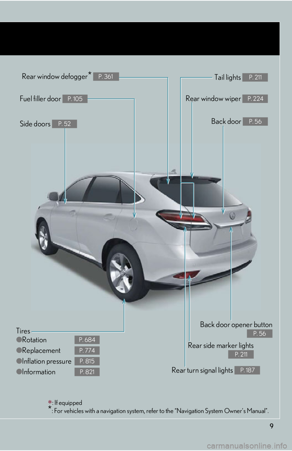 * : For vehicles with a navigation system, re fer to the “Navigation Sy stem Owner’s Manual”.Tail lights P. 211