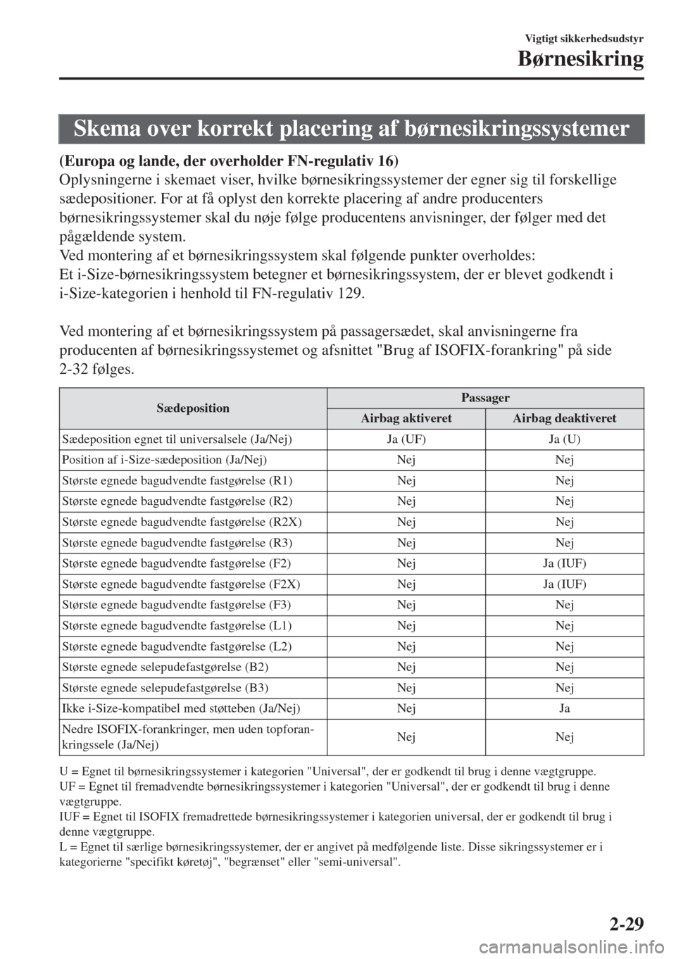 IL = Egnet til bestemte ISOFIX-børnesikringssystemer (CRS), som angivet på den medfølgende liste. Disse
