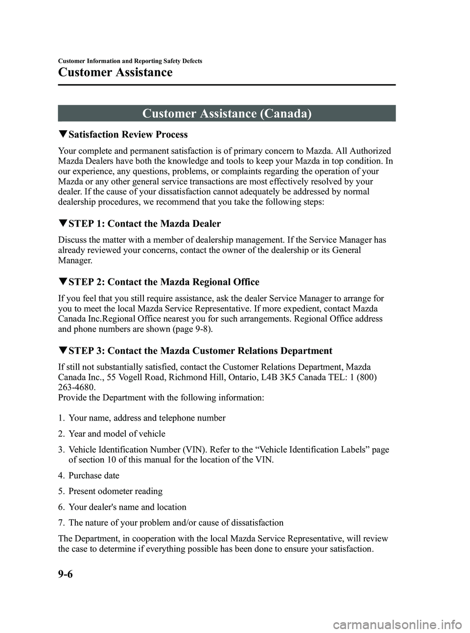 If still not substantially satisfied, contact the Customer Relations Department, Mazda