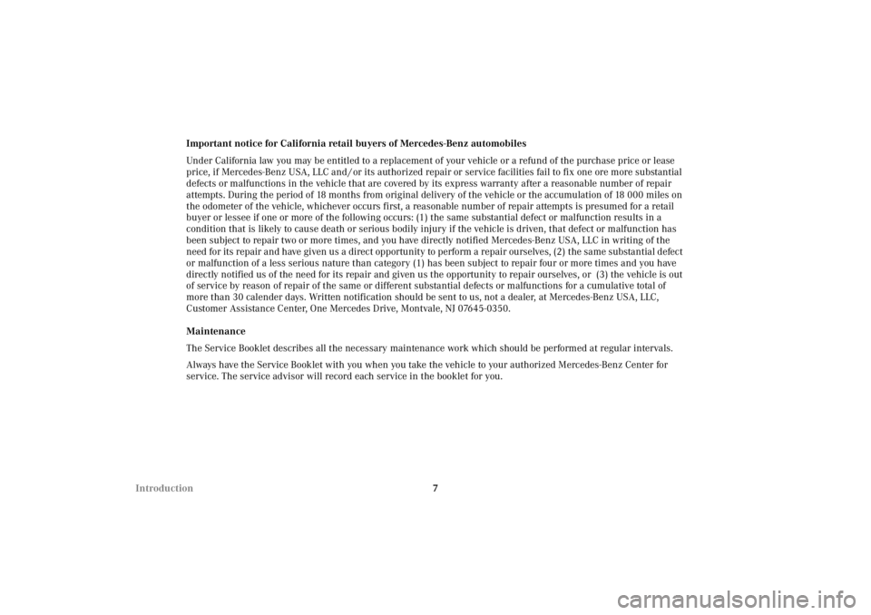 7 IntroductionImportant notice for California retail buyers of Mercedes-Benz automobiles