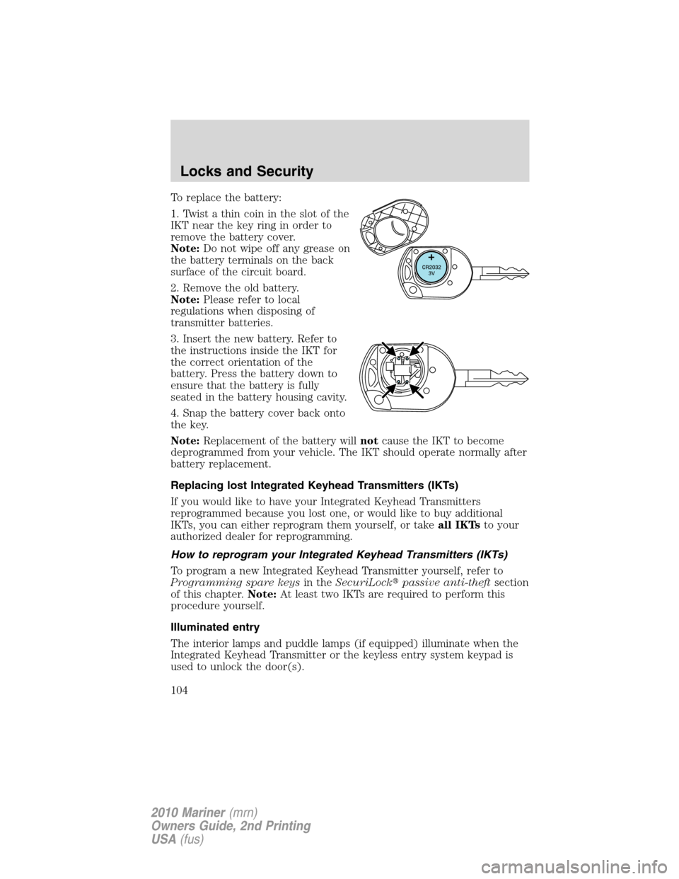 Mercury Mariner 2010  Owners Manuals keyless entry transmitter. A maximum of eight coded keys can be