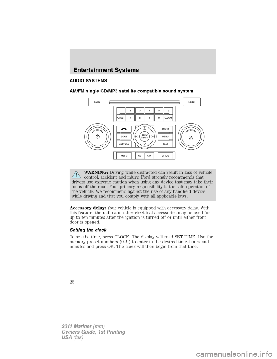 set clock Mercury Mariner 2011 Owner's Manuals