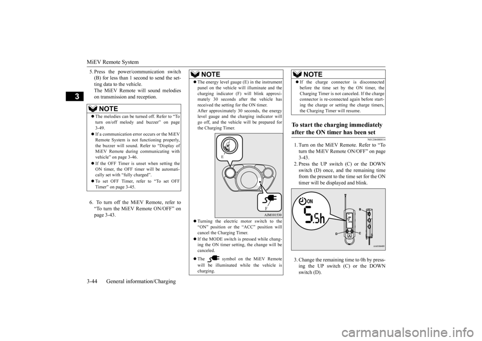 (B) for less than 1 second to send the set-ting data to the vehicle. The MiEV Remote will sound melodies on transmis- sion and reception. The charging willstart. Refer to “Regular charging (charging method with rated AC 120 V outlet)” onpage 3-16. 5. Turn off the MiEV Remote. Refer to “To turn the MiEV Remote ON/OFF” on page 3-43.