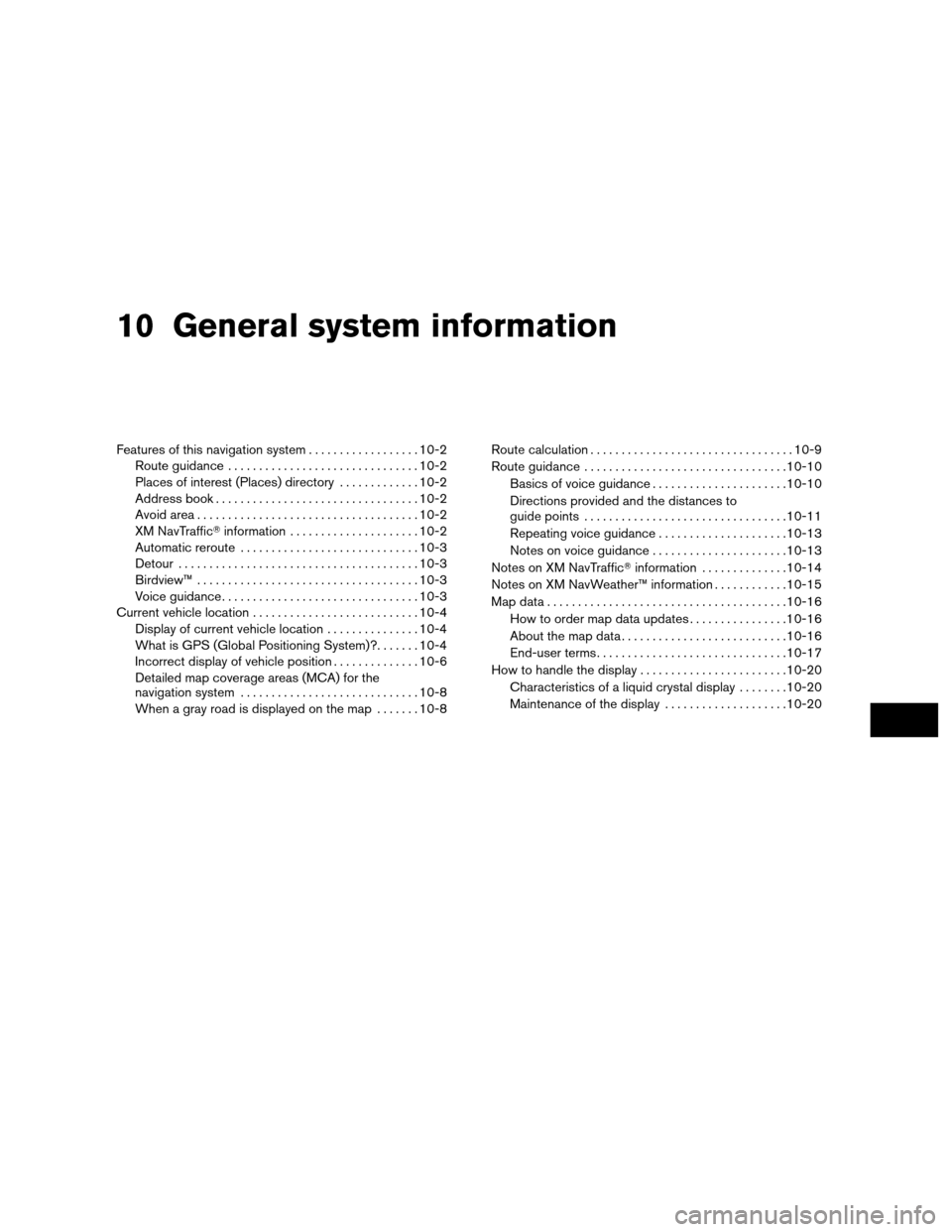 XM NavTraffic information..................... 10-2