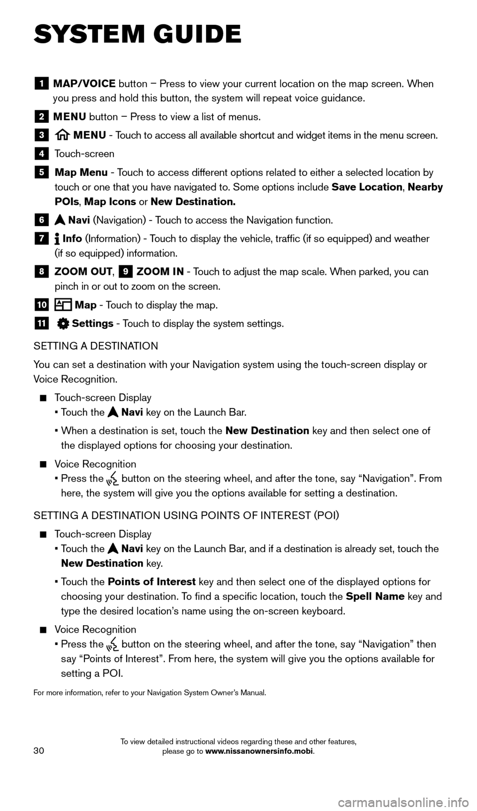 To view detailed instructional videos regarding these and other features, please go to www.nissanownersinfo.mobi.