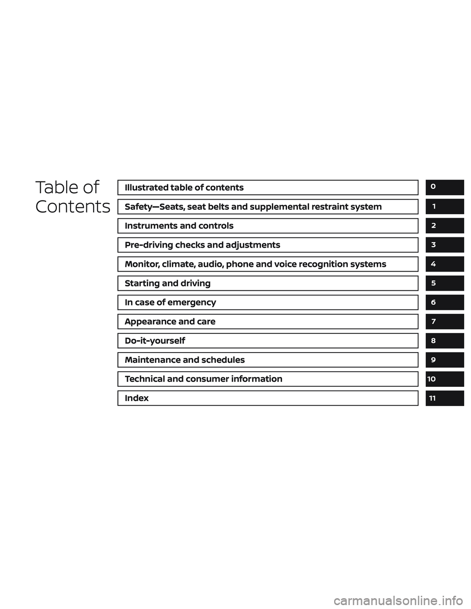 NISSAN MAXIMA 2020  Owner´s Manual Table of