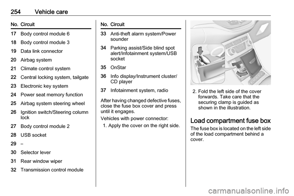 254Vehicle careNo.Circuit17Body control module 618Body control module 319Data link connector20Airbag system21Climate control system22Central locking system, tailgate23Electronic key system24Power seat memory function25Airbag system steering wheel26Ignition switch/Steering column