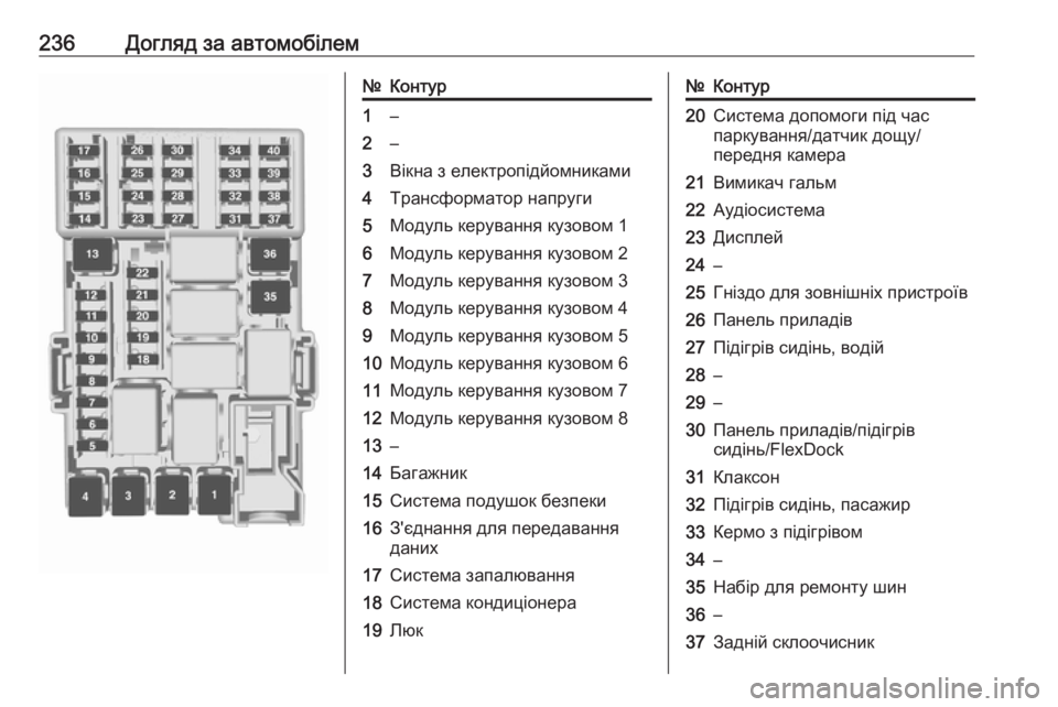 236Догляд за автомобілем№Контур1–2–3Вікна з електропідйомниками4Трансформатор напруги5Модуль керування кузовом 16Модуль керування кузовом 27Модуль керування кузовом 38Модуль керування кузовом 49Модуль керування кузовом 510Модуль керування кузовом 611Модуль керування кузовом 712Модуль керування кузовом 813–14Багажник15Система подушок безпеки16З'єднання для передавання