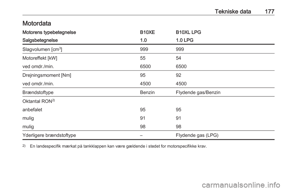 ![OPEL KARL 2016.5 Instruktionsbog (in Danish) Tekniske data177MotordataMotorens typebetegnelseB10XEB10XL LPGSalgsbetegnelse1.01.0 LPGSlagvolumen [cm3