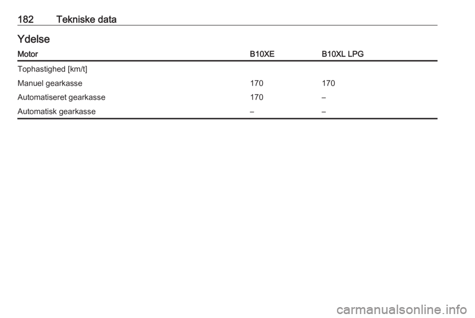 182Tekniske dataYdelseMotorB10XEB10XL LPGTophastighed [km/t]Manuel gearkasse170170Automatiseret gearkasse170–Automatisk gearkasse––