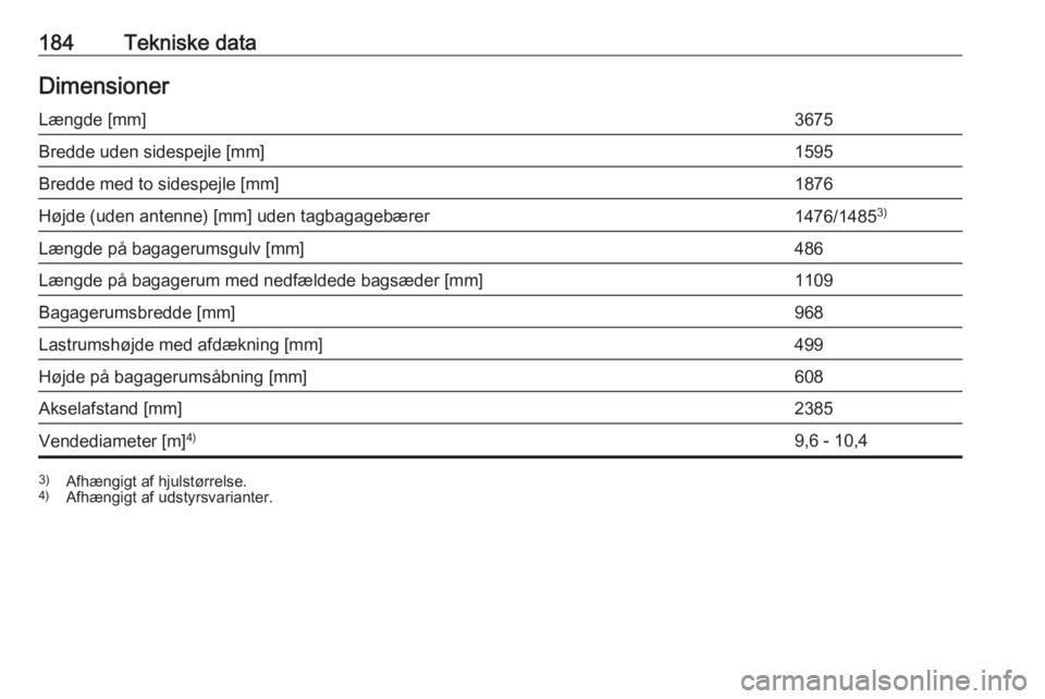 184Tekniske dataDimensionerLængde [mm]3675Bredde uden sidespejle [mm]1595Bredde med to sidespejle [mm]1876Højde (uden antenne) [mm] uden tagbagagebærer1476/14853)Længde på bagagerumsgulv [mm]486Længde på bagagerum med nedfældede bagsæder [mm]1109Bagagerumsbredde [mm]968Lastrumshøjde med afdækning [mm]499Højde på bagagerumsåbning [mm]608Akselafstand [mm]2385Vendediameter [m] 4)9,6 - 10,43)