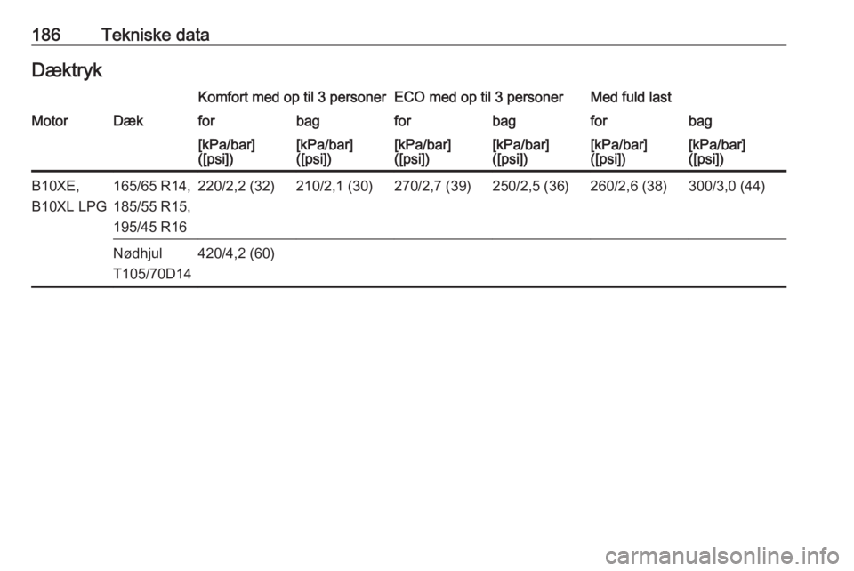 186Tekniske dataDæktrykKomfort med op til 3 personerECO med op til 3 personerMed fuld lastMotorDækforbagforbagforbag[kPa/bar]