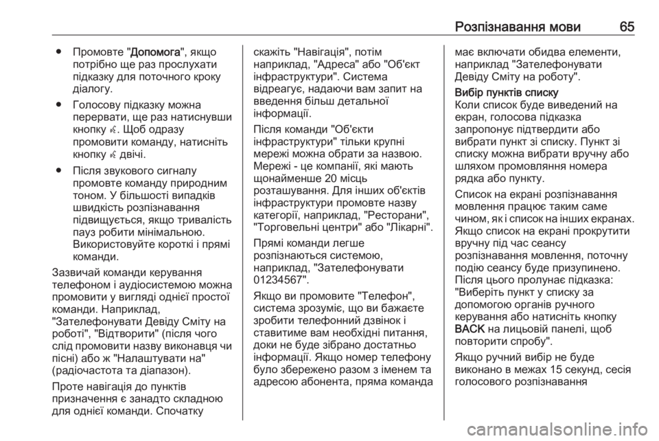 ![OPEL MOKKA 2016 Інструкція з експлуатації інформаційно-розважальної системи (in Ukrainian) Розпізнавання мови69МенюДіяГолосові командиМеню навігаціїВведення пункту