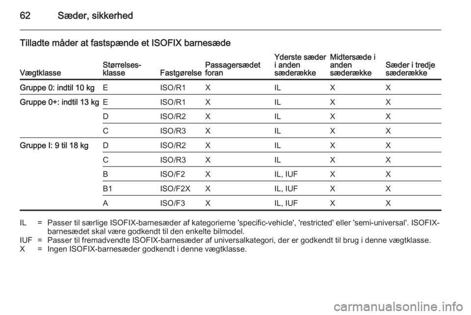 sæderækkeGruppe 0: indtil 10 kgEISO/R1XILXXGruppe 0+: indtil 13 kgEISO/R1XILXXDISO/R2XILXXCISO/R3XILXXGruppe I: 9 til 18 kgDISO/R2XILXXCISO/R3XILXXBISO/F2XIL, IUFXXB1ISO/F2XXIL, IUFXXAISO/F3XIL, IUFXXIL=Passer til særlige ISOFIX-barnesæder af kategorierne 'specific-vehicle', 'restricted' eller 'semi-universal'. ISOFIX-