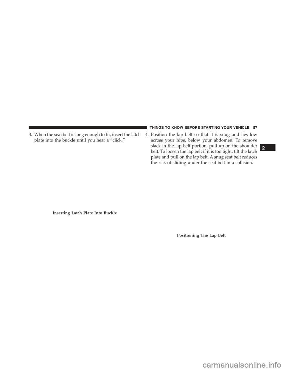 3. When the seat belt is long enough to fit, insert the latchplate into the buckle until you hear a “click.” 4. Position the lap belt so that it is snug and lies low