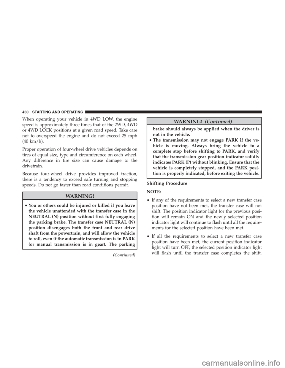 driveline components. When operating your vehicle in 4WD LOW, the engine