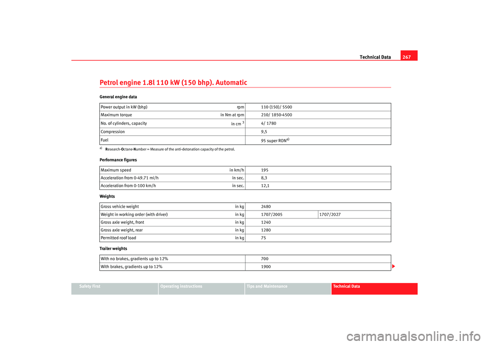 268Engine oil capacityPetrol engine 2.8l VR61 50 kW (204 bhp) 6 gearGeneral engine data