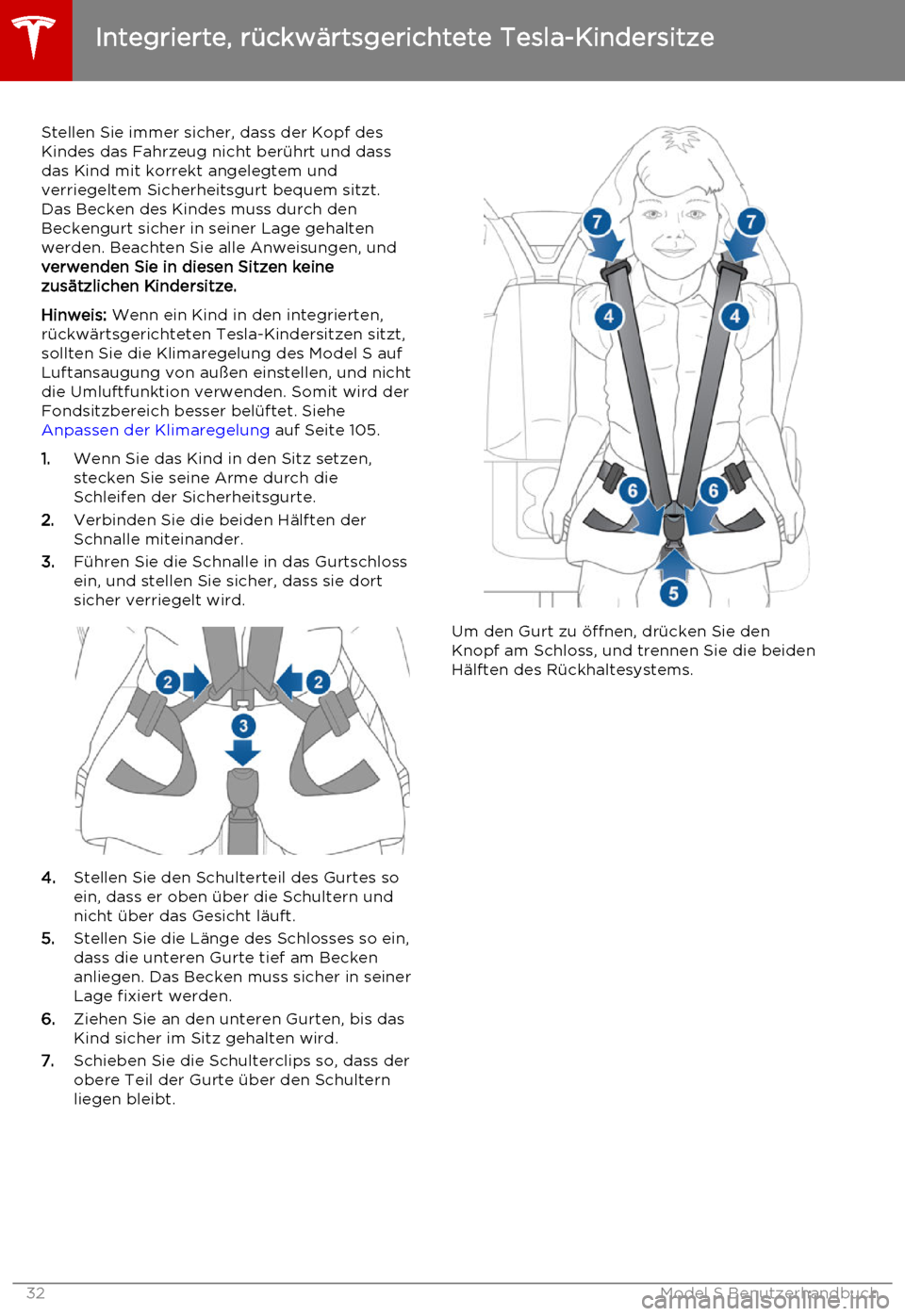 unbeaufsichtigt im Model S, selbst wenn das Kind in einem Kindersitz oder einemintegrierten, rückwärtsgerichteten TeslaKindersitz angeschnallt ist. Bei heißemWetter kann die Temperatur im