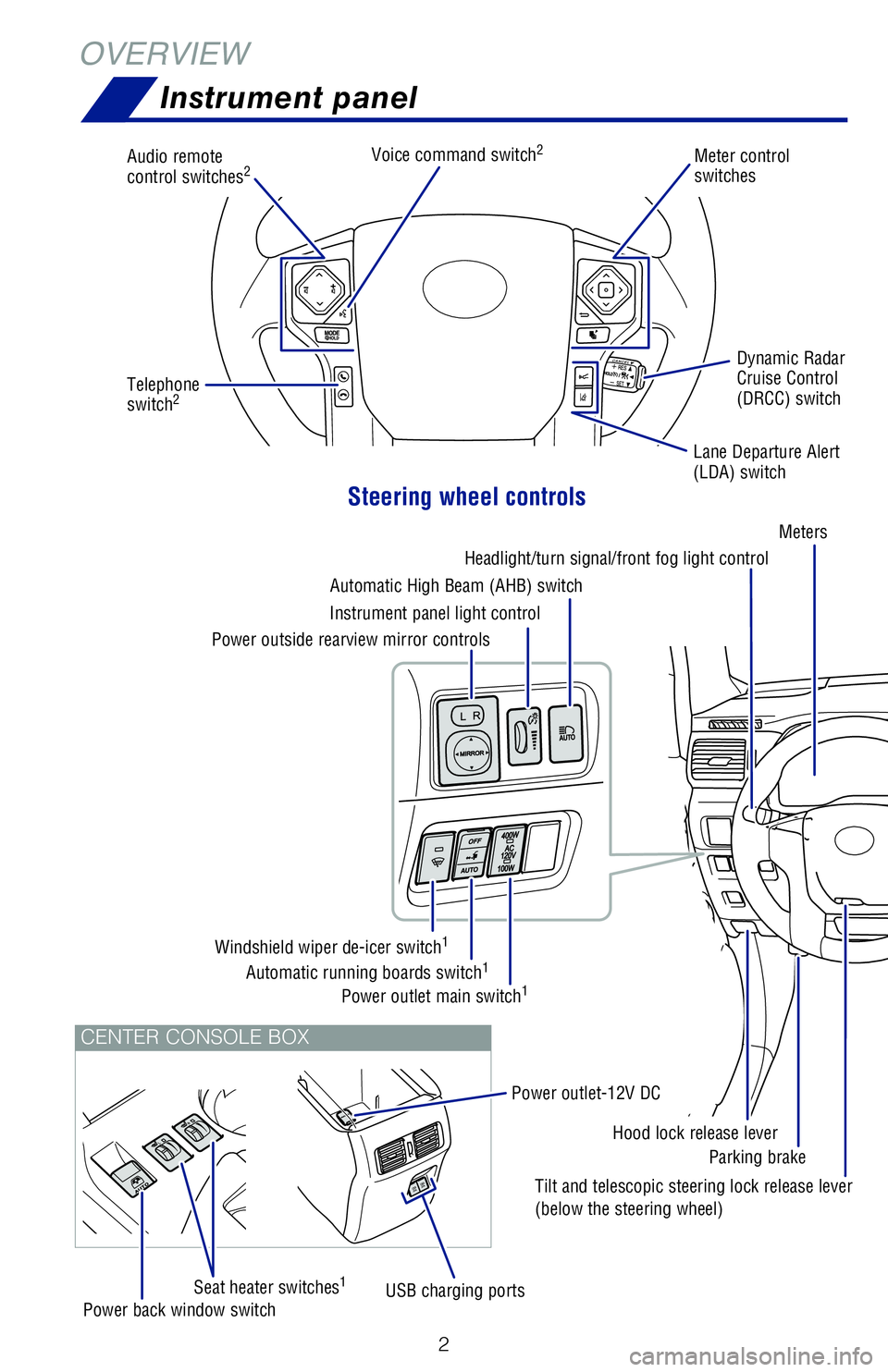 1 Visit your Toyota dealer for information on customizing this feature.2 Programmable by customer. Refer to the Owner’s Manual for instructions and more information.3 HomeLink® is a registered trademark of Gentex Corporation.