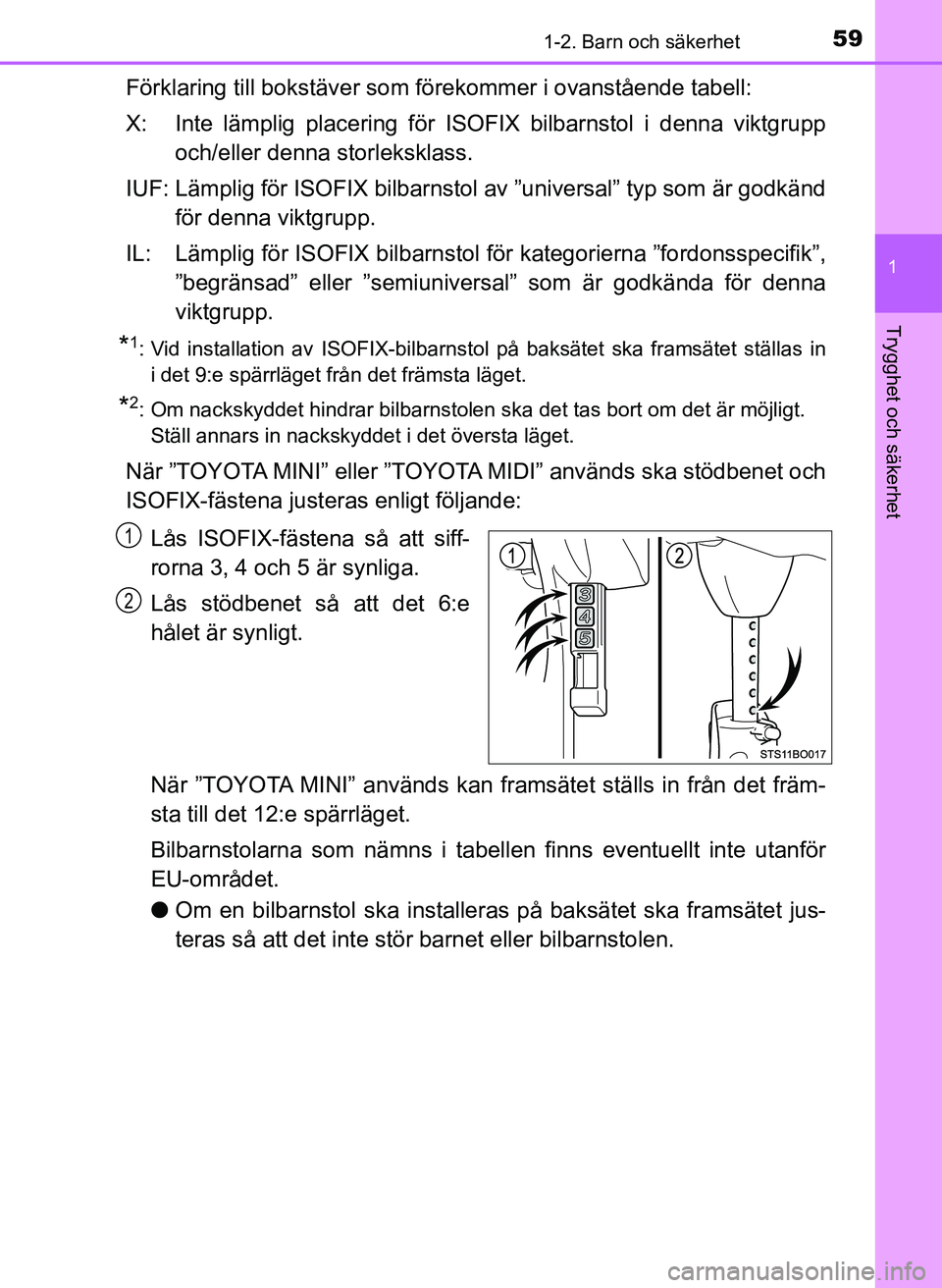 *1: Vid installation av ISOFIX-bilbarnstol på baksätet ska framsätet ställas in i det 9:e spärrläget från det främsta läget.
