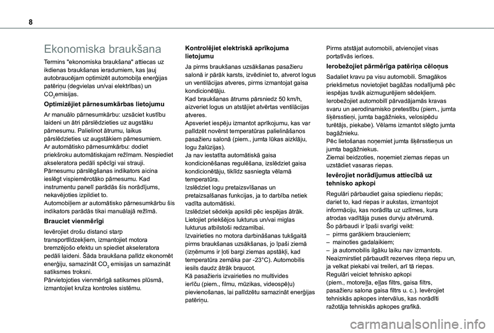 7Praktiska informācijaDegvielu saderība 2 11Degvielas uzpilde 2 11Nepiemērotas degvielas uzpildes novēršana (dīzeļdegviela) 213Uzlādes sistēma (elektroautomobilis) 214Vilces akumulatora uzlāde (elektroautomobilis) 222Enerģijas ekonomijas režīms 226