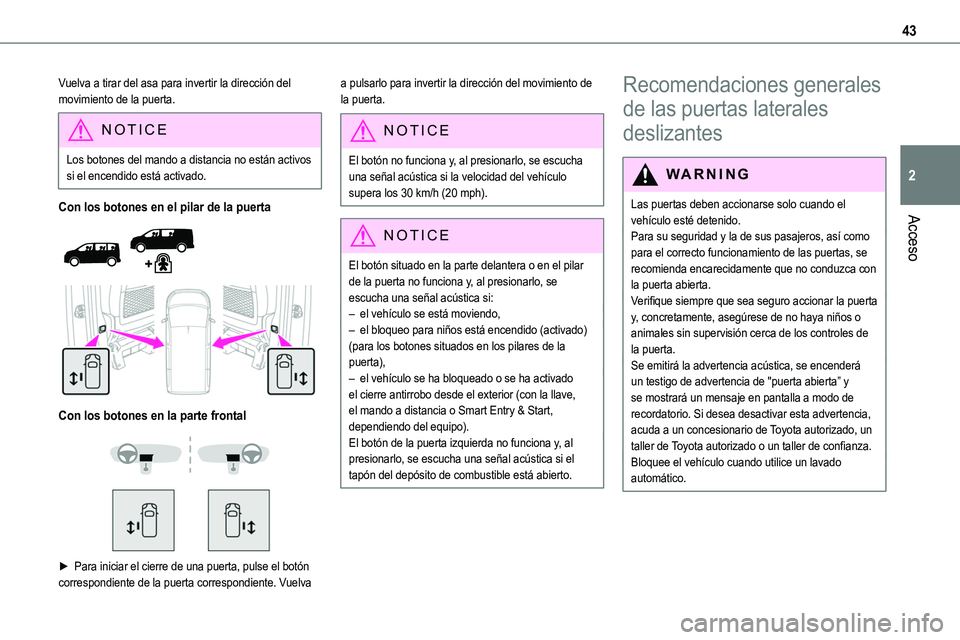 Para su seguridad y la de sus pasajeros, así como para el correcto funcionamiento de las puertas, se recomienda encarecidamente que no conduzca con la puerta abierta.Verifique siempre que sea seguro accionar la puerta y, concretamente, asegúrese de no haya niños o animales sin supervisión cerca de los controles de la puerta.Se emitirá la advertencia acústica, se encenderá un testigo de advertencia de "puerta abierta” y se mostrará un mensaje en pantalla a modo de recordatorio. Si desea desactivar esta advertencia, acuda a un concesionario de Toyota autorizado, un taller de Toyota autorizado o un taller de confianza.Bloquee el vehículo cuando utilice un lavado automático.