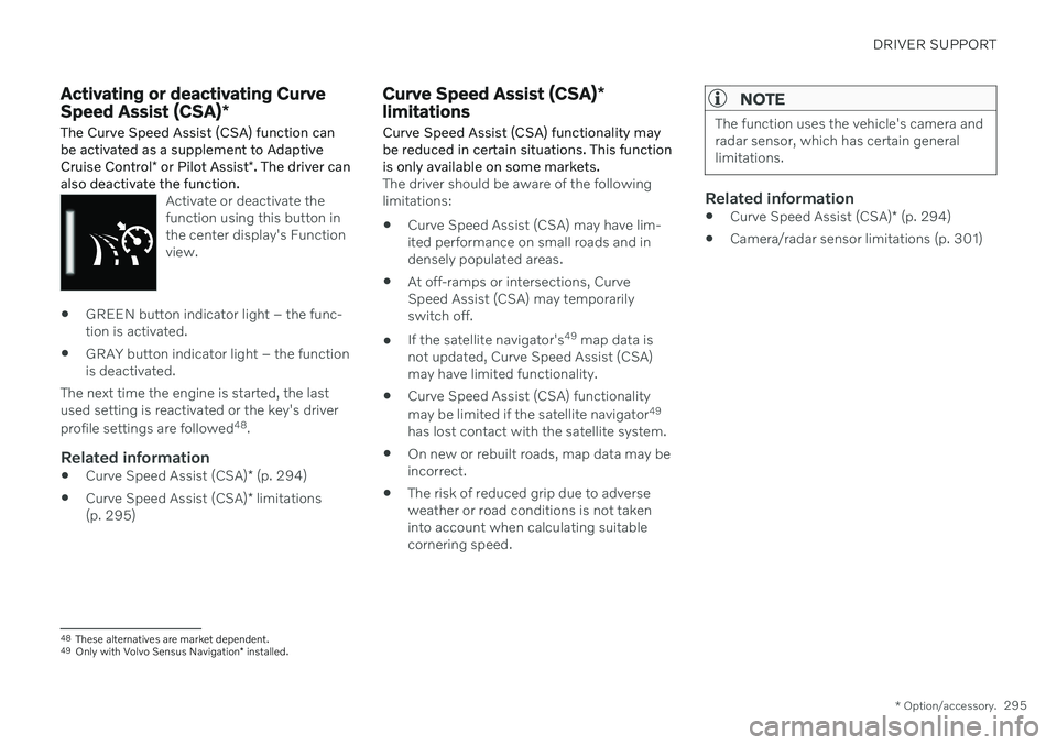 The Curve Speed Assist (CSA) function can be activated as a supplement to Adaptive Cruise Control * or Pilot Assist *. The driver can