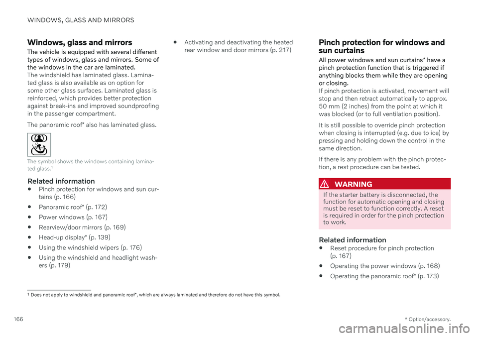 The windshield has laminated glass. Lamina- ted glass is also available as on option forsome other glass surfaces. Laminated glass isreinforced, which provides better protectionagainst break-ins and improved soundproofingin the passenger compartment. The panoramic roof * also has laminated glass.