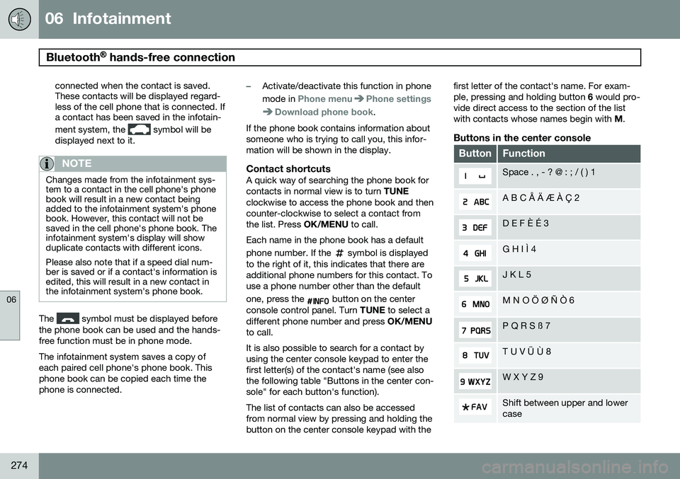 to call. It is also possible to search for a contact by using the center console keypad to enter thefirst letter(s) of the contact's name (see alsothe following table "Buttons in the center con-sole" for each button's function). The list of contacts can also be accessed from normal view by pressing and holding thebutton on the center console keypad with the first letter of the contact's name. For exam-ple, pressing and holding button