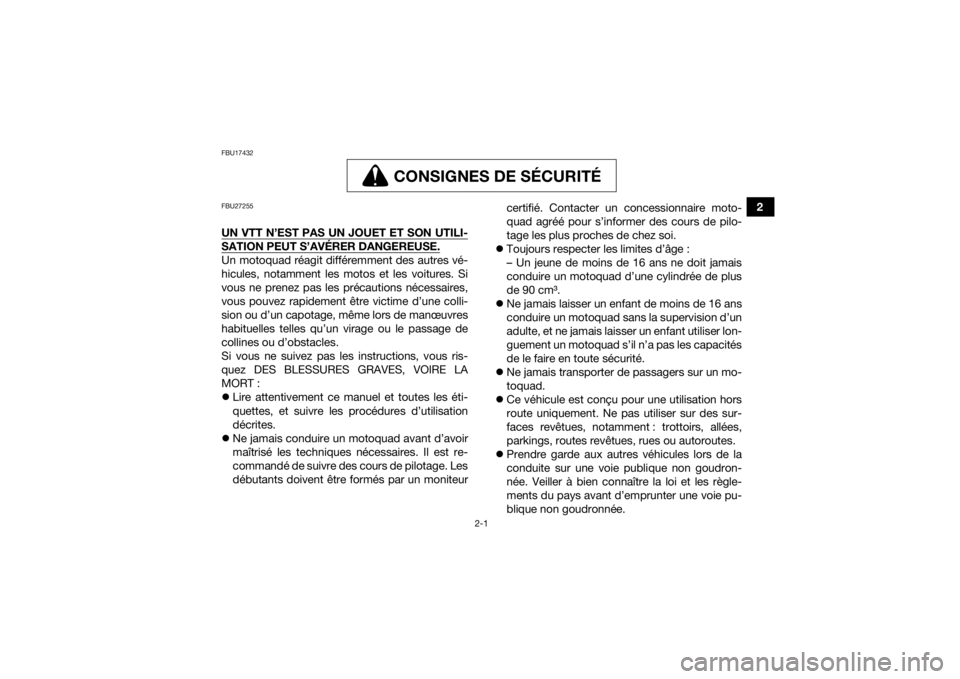 FBU27255UN VTT N’EST PAS UN JOUET ET SON UTILI-SATION PEUT S’AVÉRER DANGEREUSE.Un motoquad réagit différemment des autres vé-