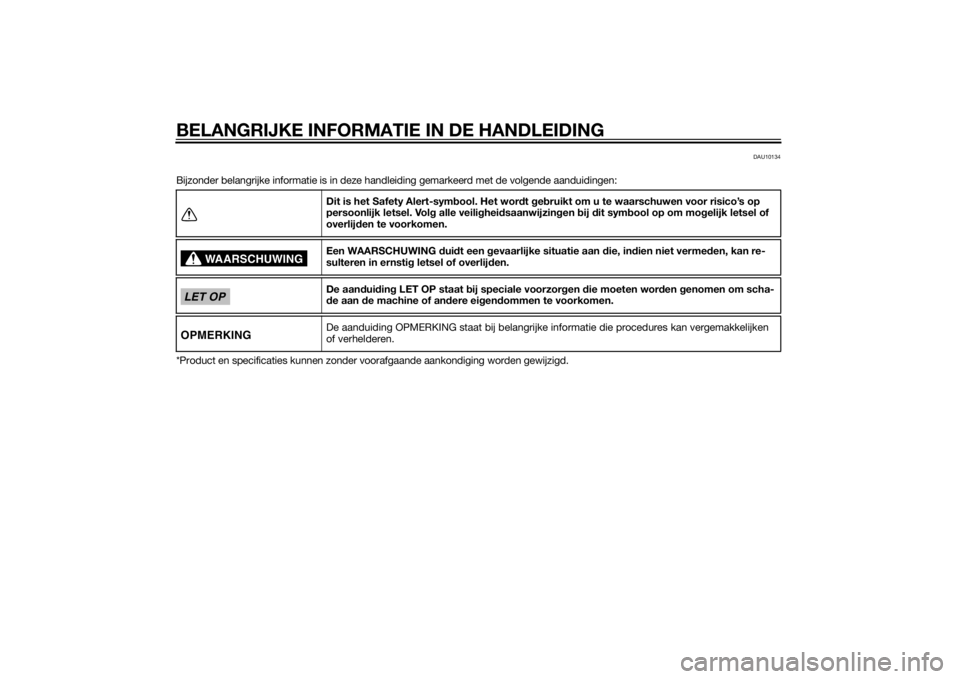 *Product en specificaties kunnen zonder voorafgaande aankondiging worden gewijzigd.Dit is het Safety Alert-symbool. Het wordt gebruikt om u te waarschuwen voor risico’s op